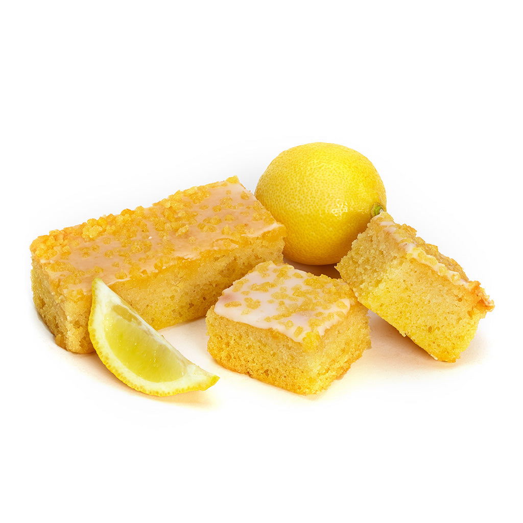 Uma fatia de bolo embalada com sabores cítricos zesty e coberta com uma cobertura de fondant sabor limão criando um deleite leve. Embrulhado individualmente para garantir o frescor.